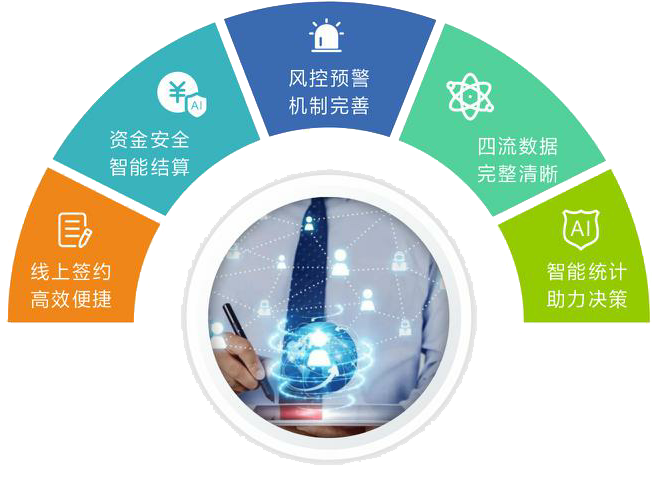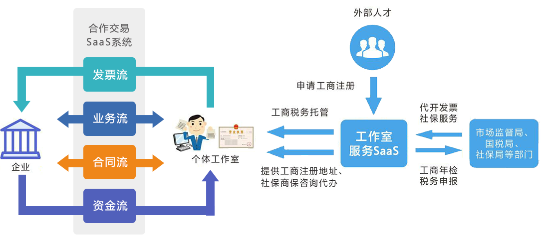 企业与外部人才工作任务合作交易SaaS及流程简介 全线上完成企业与外部人才合同协议签署、工作任务接发包管理、业务证据流管理、服务费结算支付、发票管理,实现企业与外部人才工作任务合作交易“四流合一”,交易结算支付快捷高效,有效防控涉税风险,降低企业业务及财务管理成本; 全线上完成外部人才个体工作室工商税务注册注销及托管服务,省时省心快捷,充分享受国家针对个体工商户一系列税费优惠扶持政策。